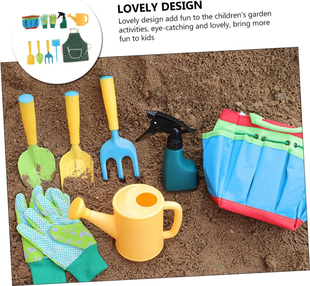 Package Include 1 x set of Planting Tools Features - Watering Can Size: About 21.5x12cm/8.46x4.72inch Funny Garden Tools. - Gloves Size: About 18x11cm/7.09x4.33inch. Watering Pot - Rake Size: About 21x7.4cm/8.27X2.91inch. Garden Tools for Plant - Apron Size: About 48x42cm/18.9X16.54inch Gardening Planting Rake. - Bag Size: About 28x24cm/11.02x9.45inch Garden Mini Shovels. - Material: Plastic, stainless steel, cloth Mini Rake. - Square Shovel Size: About 20x6.5cm/7.87x2.56inch Planting Supply. - Spray Pot Size: About 17.5x11.5cm/6.89x4.53inch Gardening Tools for Transplanting. - Pointed Shovel Size: About 21x7cm/8.27x2.76inch Gardening Tools. - Parents can build practical ability when let them enjoy the fun and enjoyment of gardening Small Gardening Tools. - fit for little hand, not too sharping, not too heavy and there are smooth surface Planting Tools. - Designed for outdoor playing time, or working alongside mom and dad in the garden Garden Tools Shovel. - ColorAssorted Color Gardening Planting Shovel - With comfortable grip handle design, this garden shovel can hand fatigue Garden Tools Kit.Goods Description Hand Planting Tools will learn much more about nature than just gardening, let young gardeners use these portable gardening tools set to help you do gardening work!.Watering Pot These gardening tools are one of for your