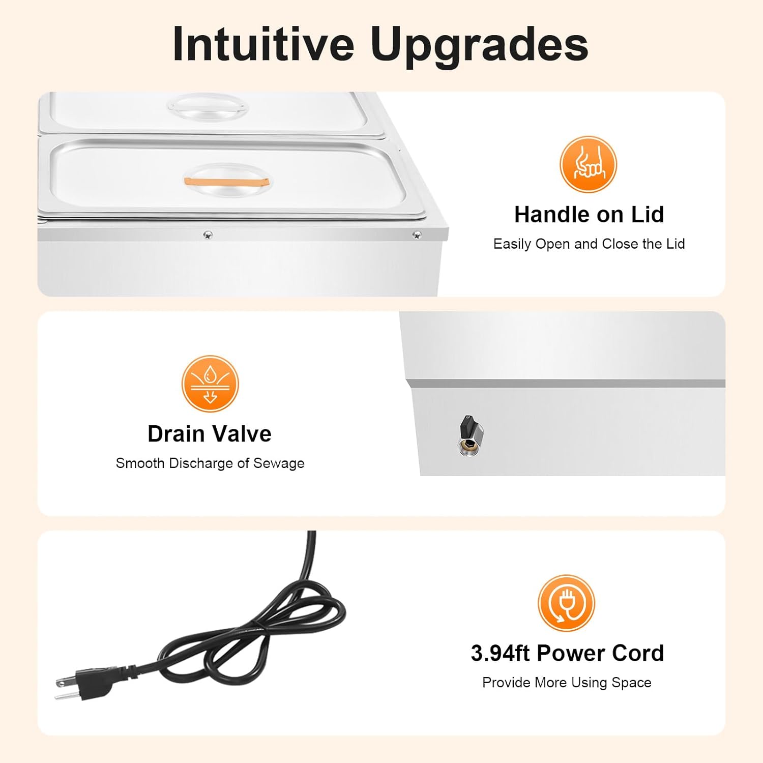 ApplicationThis product can be used to hold meat, vegetables, seafood, and other foods, and is very suitable for large gatherings, events, buffets, hotels, brunch, catering, parties, wedding banquets, and self-service restaurants.SpecificationColor: SilverShape: RectangularStyle: ModernMaterial: Stainless Steel, CopperProcess: Polishing, BrushedPower Source: Electric CordedPlug Type: US StandardInstallation Required: NoMount Type: CountertopVoltage: 110V, 60HzPower: 1500WTemperature Range: 30-110℃/86-230℉Number of Food Pans: 6 Waterproof Grade: IPX3 Each Food Pan Capacity: 6.7L/1.77galPower Cord Length: About 1.2m/3.94ftEach Food Pan Size: 32.5*17.5*15cm/12.8*6.89*5.91in(External), 30*15*15cm/11.81*5.91*5.91in(Internal)Product Size: 68.5*54*28.5cm/26.97*21.26*11.22inPackage Size: 75*65*31cm/29.53*25.59*12.2inGross Weight: 13kg/28.66 lbsNet Weight: 12.35kg/27.23 lbsPackage Included1* Food Warmer Machine6* Food Pans6* LidsNotes1. Please note that food is not included.2. This product is used to keep food warm and cannot be used as a cooking tool.3. Please make sure the water in the tank is at least 1.5 inches higher than the heating tube.4. Please note that the water in the tank must be drained out after use.5. Please allow the slight color difference caused by the shooting light and a 1-3 cm error due to manual measurement, and make sure you do not mind before ordering.