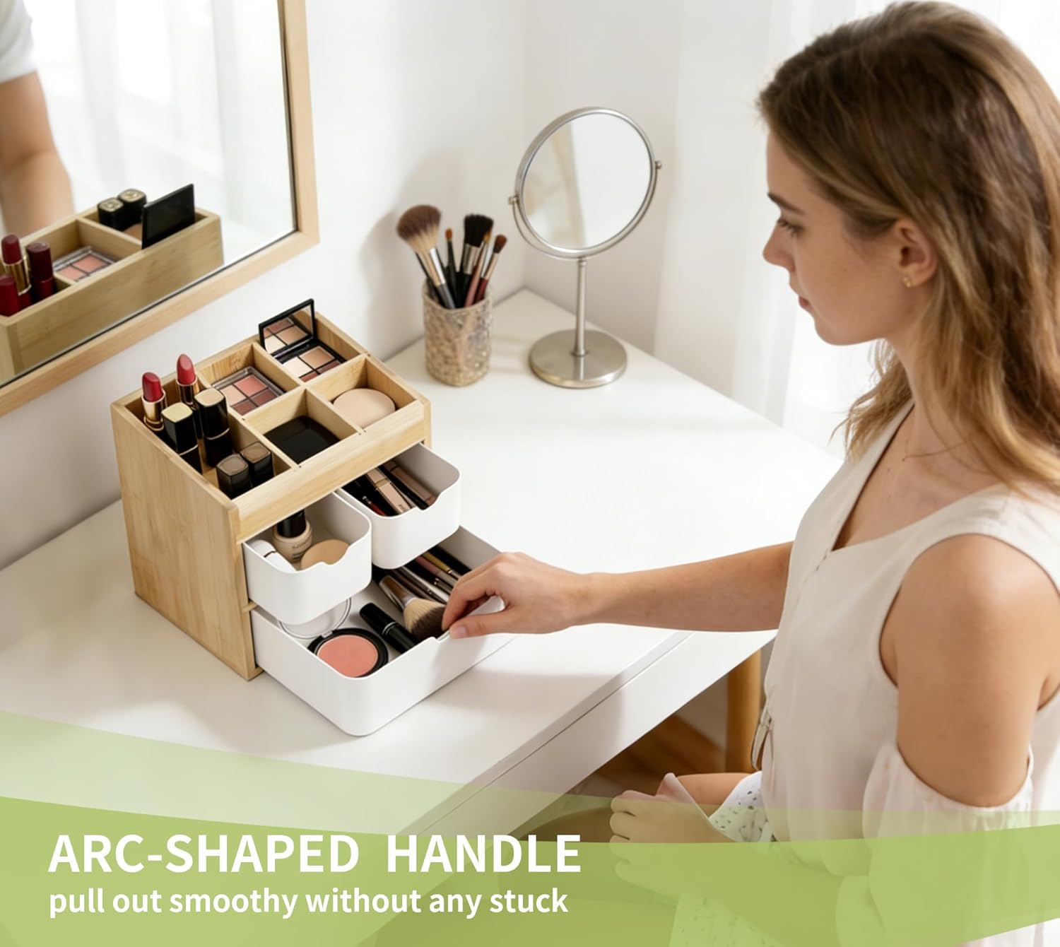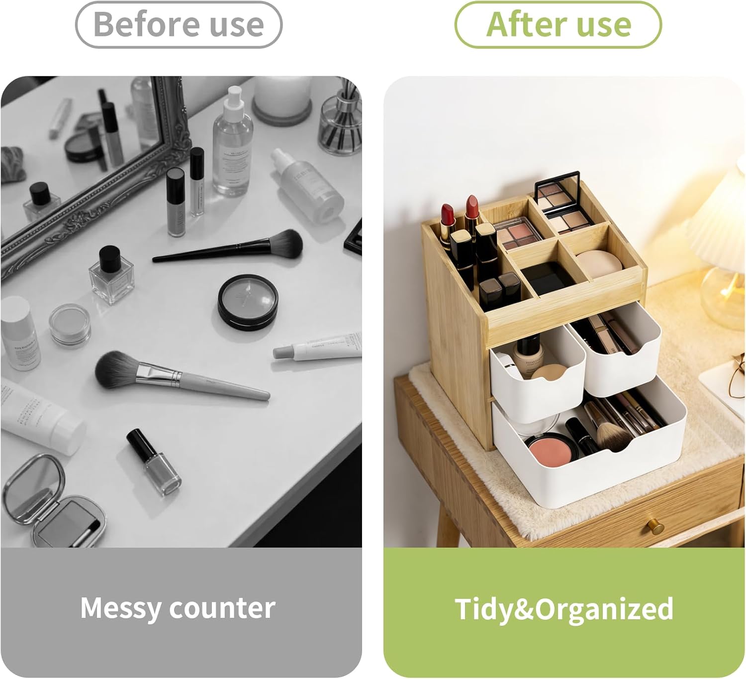 Storage Organization BoxMaterial: Bamboo and Bamboo FiberSize:7.9"*5.5"*6.8"/7.7"(20cm*14cm*17.5cm/19.5cm)Bring timeless elegance and effortless order to your daily routine with our all-in-one Bamboo Drawer Organizer. Designed for the modern home, this versatile piece seamlessly blends into your vanity, desk, or bathroom counter, transforming clutter into a curated display.Experience Unmatched VersatilityWhether you're tidying your makeup collection, organizing important office supplies, or creating a dedicated spot for your skincare and jewelry, this organizer adapts to your needs. The adjustable compartments and three spacious drawers provide a home for everything, ensuring your favorite items are always within reach yet neatly stored away.Sustainable Design, Smart FeaturesWe believe organization should be simple, sustainable, and stylish. Crafted from renewable bamboo, this organizer is as kind to the planet as it is to your belongings. The thoughtful design, including the one-handed pull drawers and non-slip base, guarantees a smooth and stable experience every day.Ideal for Every SpaceOn Your Vanity:Keep foundations, lipsticks, and jewelry orderly.On Your Desk:Sort pens, paper clips, and sticky notes.In Your Bathroom:Organize travel-size perfumes, cotton swabs, and sample sizes.A Perfect Gift: Celebrate life's moments with a practical and beautiful present.