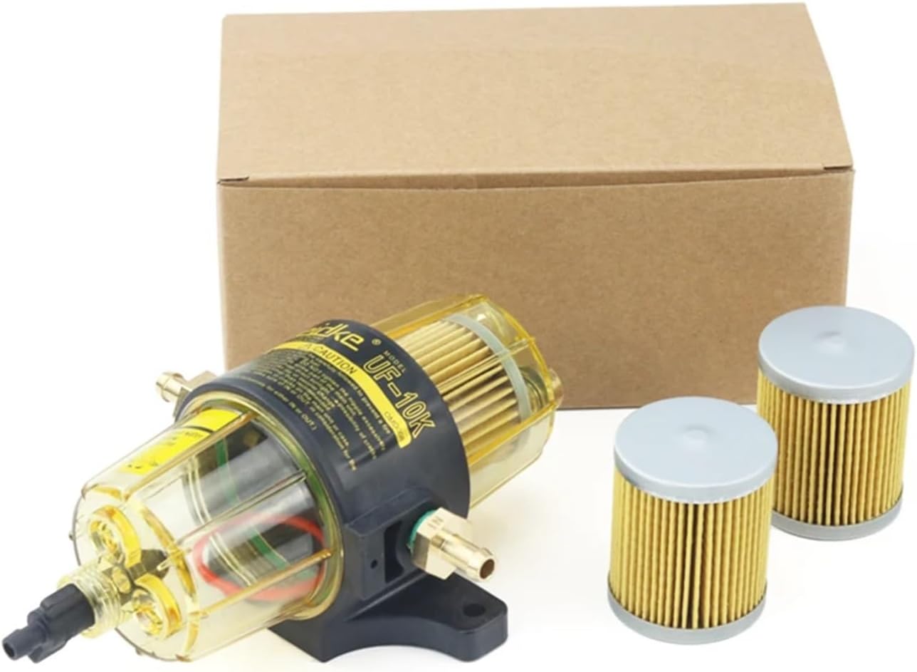 FiltersFits all outboard up to 350hp with a maximum fuel flow up to 31 gallons/hour (117 liters/hour)Features:Removes 99.9% of water that may be present in the fuel tankEquipped with a transparent bowl with o-ring water level gauge lets you see at a glance how much water has been trapped by the filterEasy access drain valve allows you to drain all trapped water without having to remove the entire filterApproved for use with ethanol blended fuels, a common cause of water in fuelIncludes 10,30 , easy replacement filter elementIncludes Fuel line adapters, unlike other modelsHas a removable magnet (for cleaning) that reduces metal particulate in the fuelEasy installationCorrosion Measures 9" x 6" x 3.5" Item:Filter AssemblyMaterial: paperPart No.: UF-10KHeight: 85mmOD/Width Max: 210mmID/Depth Max:120mmSuit for car model:For Outboard Engine==========Other Part Number : UF-10KPlacement on Vehicle : Fuel supplyInterchange Part Number : UF-10KSpecial Features : Replacement filterItem Weight : 0.8kgItem Height : 85mmItem Width : ID Depth Max 120mmItem Length : OD Width Max 210mm Part Number : UF-10KMaterial : Plastic NO. : UF-10KType : UF-10K Assembly with 2 extra filter