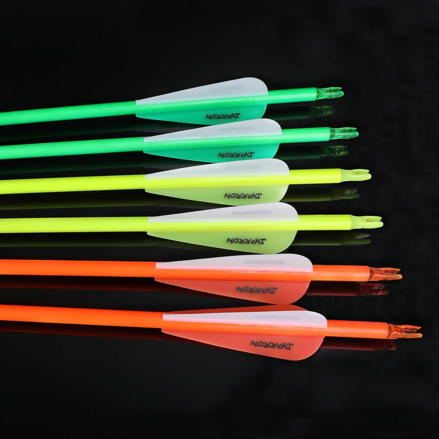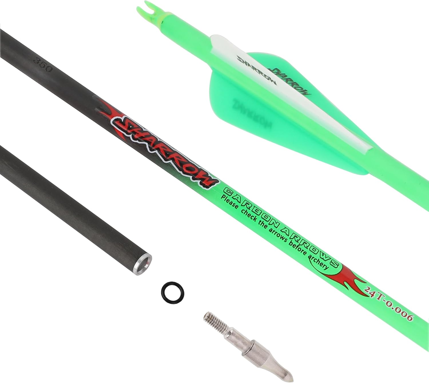 Item name: pure carbon arrows Color: green, orange, yellow Standard Length: 32 inch/81.3cm Total length: 33.54inch/85.2cm Spine 300/350/400/500/600 OD: different spine different OD ID: 6.2mm Point: 100 grain with O ring Package include:6/12 x pure carbon arrows