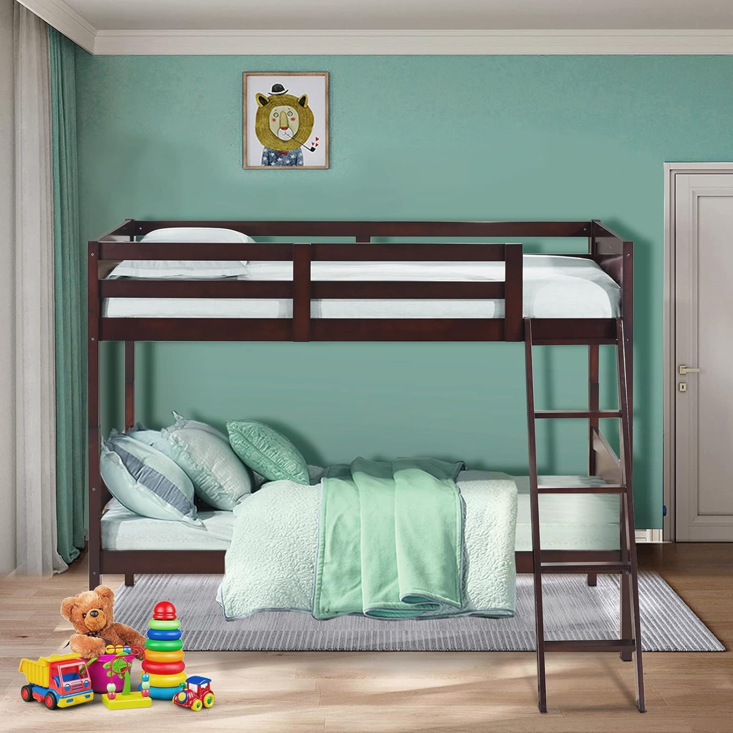 This detachable twin over twin bunk bed provides security and protection to your children. The stable safety guardrails prevent your kids from falling off. It's equipped with a sturdy 5-step ladder for quick and easy access to the top bunk. Construed of solid wood slates, the bunk bed has good bearing capacity, each bunk holds up to 400 lbs and the ladder holds up to 330 lbs. With your children growing up, you can divide the bunk bed into two separate beds to give them their own independent space.(Note: This bunk bed is packed in 2 boxes which might arrive separately)Features:* Can be separated into 2 twin-size beds* All-around safety guardrails for security* 5-step ladder for quick and easy access to top bunk* Made of high-quality solid rubber wood* A large weight capacity of 400 lbs for each bunk* Space saving, suitable for kids' room, dormitory, apartment* Easy to assemble with clear instructionSpecifications:Color: White / EspressoMaterial: Rubberwood, Engineered WoodDimensions: 79'' x 39'' x 66.5'' (L x W x H)Weight Capacity of Each Bunk: 400 lbsWeight Capacity of Ladder: 330 lbsPackage Includes:1 x Bunk Bed with Ladder1 x Instruction